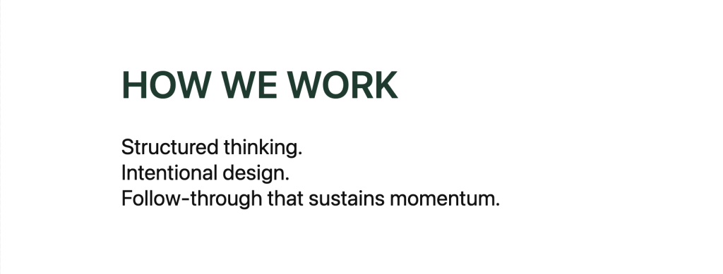 The practice sits at the intersection of strategy, facilitation, and execution — supporting leaders as they navigate complexity, make decisions, and translate intent into action.